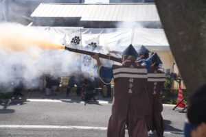 ちょうど、目の前で大人気パフォーマンスである火縄銃演武が行われていました!